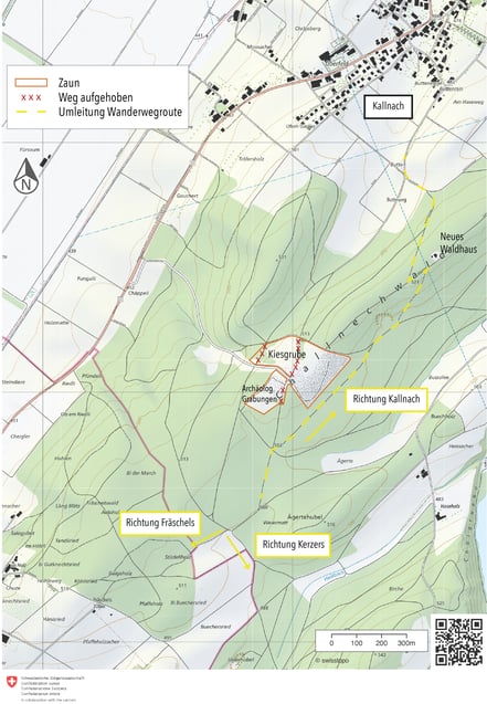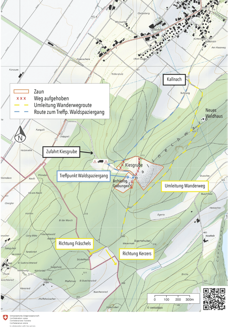10.8.2023. Aufgrund des fortschreitenden Kiesabbaus wird der Wanderweg Richtung Fräschels