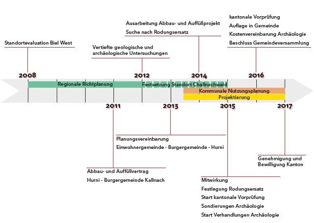 Der Standort Challnechwald wird in den regionalen Richtplan ADT (Abbau, Deponie, Transporte) der Region Biel-Seeland aufgenommen. Der im August 2012 genehmigte Richtplan legt den Bedarf für einen neuen Kiesabbaustandort Challnechwald zur Versorgung des Raums Biel-West dar. Der «Challnechwald» ist im Richtplan als einer jener Standorte aufgeführt, wo zwar Klarheit über die nächsten planerischen Schritte besteht, jedoch noch nicht alle räumlichen Fragen geklärt werden konnten (Zwischenergebnis). Zur Klärung der räumlichen Fragen lässt Hurni das Gebiet vertieft geologisch und archäologisch untersuchen.